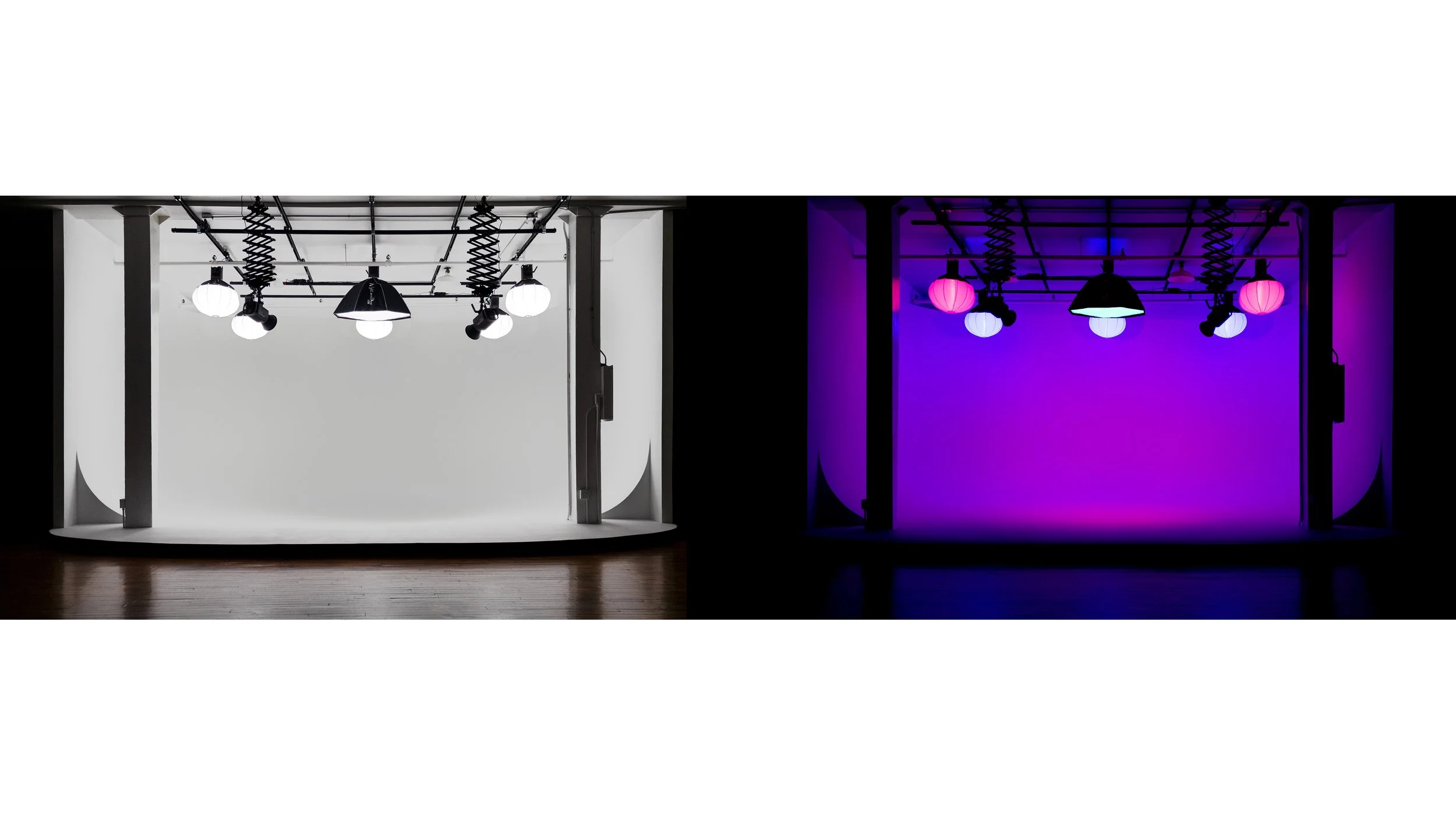 Our U-shaped cyc wall features a 36″ radius curve for a perfect seamless look, finished in non-reflective “TV White” paint so colors stay accurate under any lighting. The cyc comes fully lit with 8 Amaran 300c RGBWW fixtures mounted on a 15×15 lighting grid, all wirelessly controlled via Sidus Link on a provided iPad — giving you instant access to pure white or full-spectrum color with the touch of a button, featuring preprogrammed lighting scenes by Wreckcreation Co.